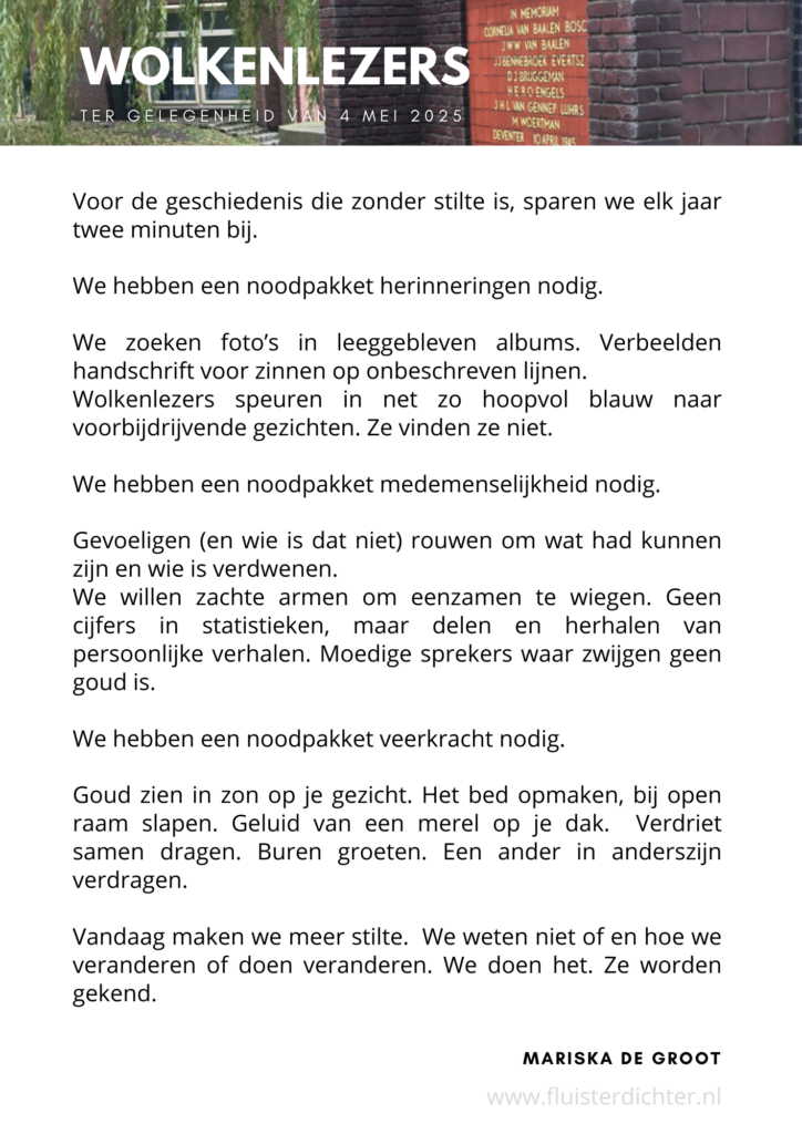 Categorieën Geen categorie 4 mei gedicht Wolkenlezers Berichtauteur Door Fluisterdichter Berichtdatum 5 mei 2025 1 reactie op 4 mei gedicht Wolkenlezers